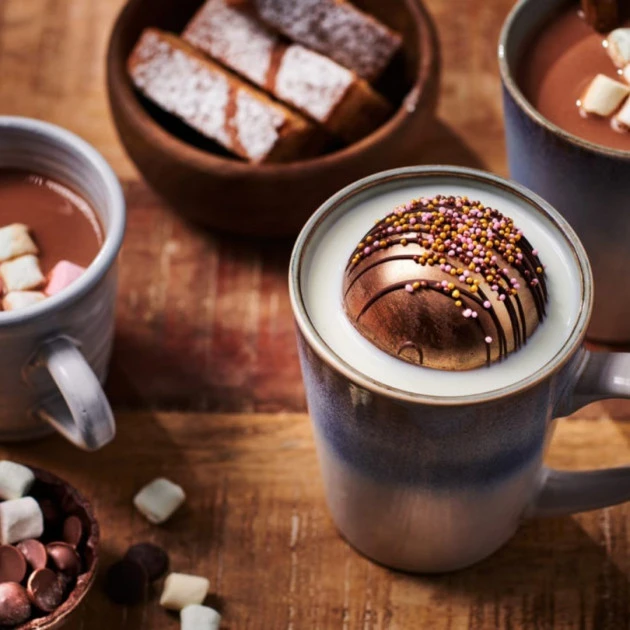 6- Laissez refroidir une instant au réfrigérateur. Pendant ce temps, faites-vous chauffer une belle tasse de lait, puis insérez-y une boule en chocolat 3D et régalez-vous !